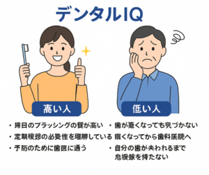 IQといえば“知能指数”を思い浮かべる方が多いと思いますが、デンタルIQは「お口の健康に関する知識や意識のレベル」のことを指します。